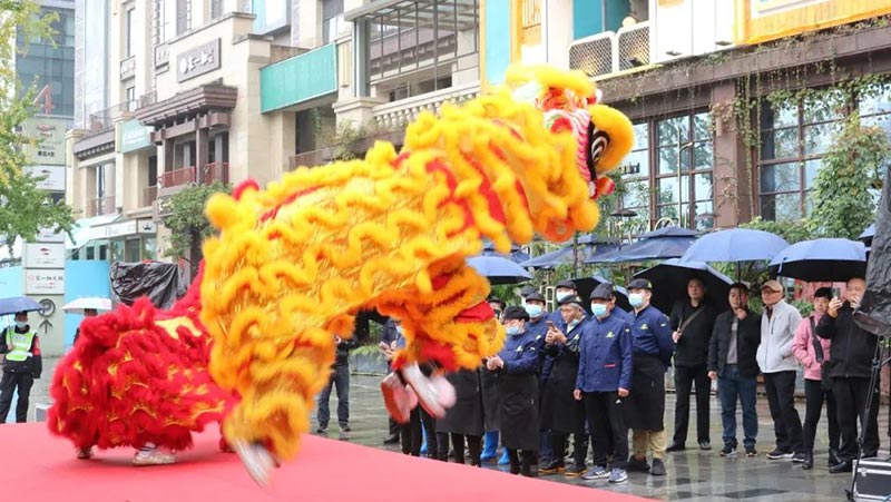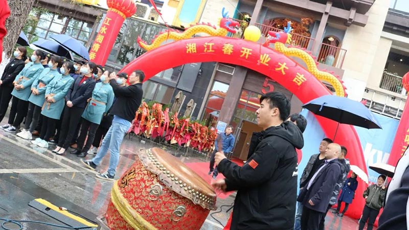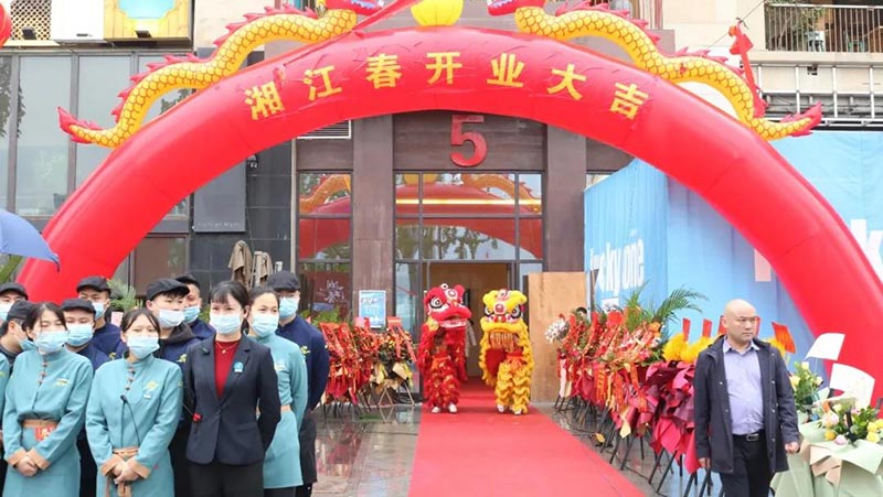 开业庆典仪式上,湘江春特邀的民俗演员们首先为大家表演了一场精彩的梅花桩舞狮表演,寓意着饭店在未来的发展中,定能前程似锦,大展宏图。湖南省餐饮协会湘菜大师专家委员会副主席邓志明、湘菜大师万民、李峰、湘菜大师兼湘江春创始人张人俊、湘江春重庆分公司董事长龙超等领导与来自各地的主流媒体共同观看了舞狮表演,并为吉祥雄狮点睛。
